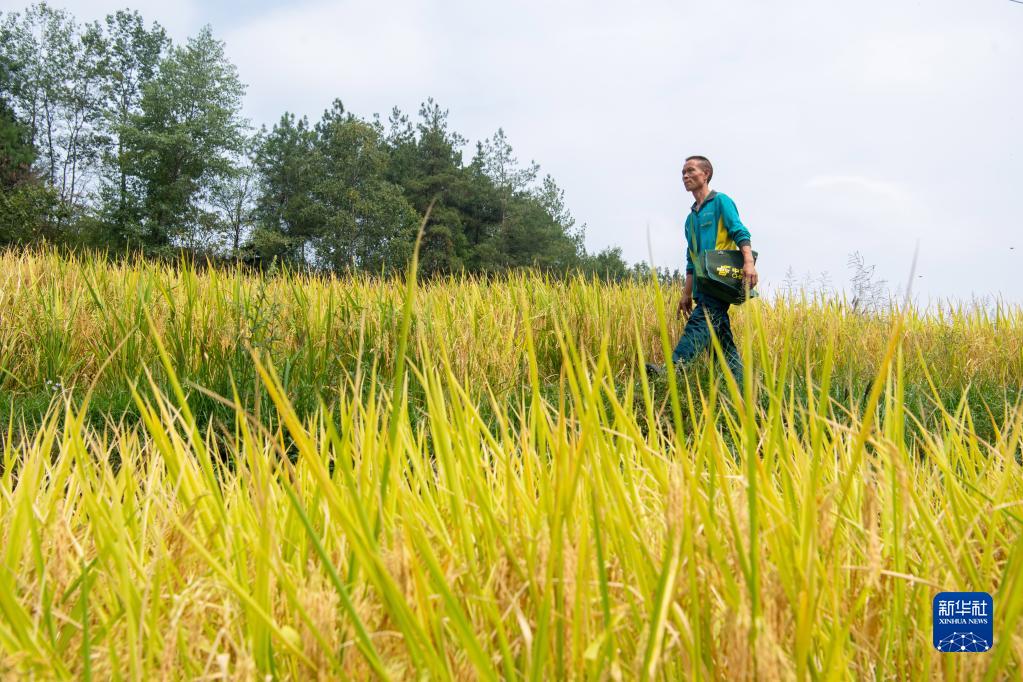 9月15日,投递员张永洪行走在武陵山间的稻田田坎上。