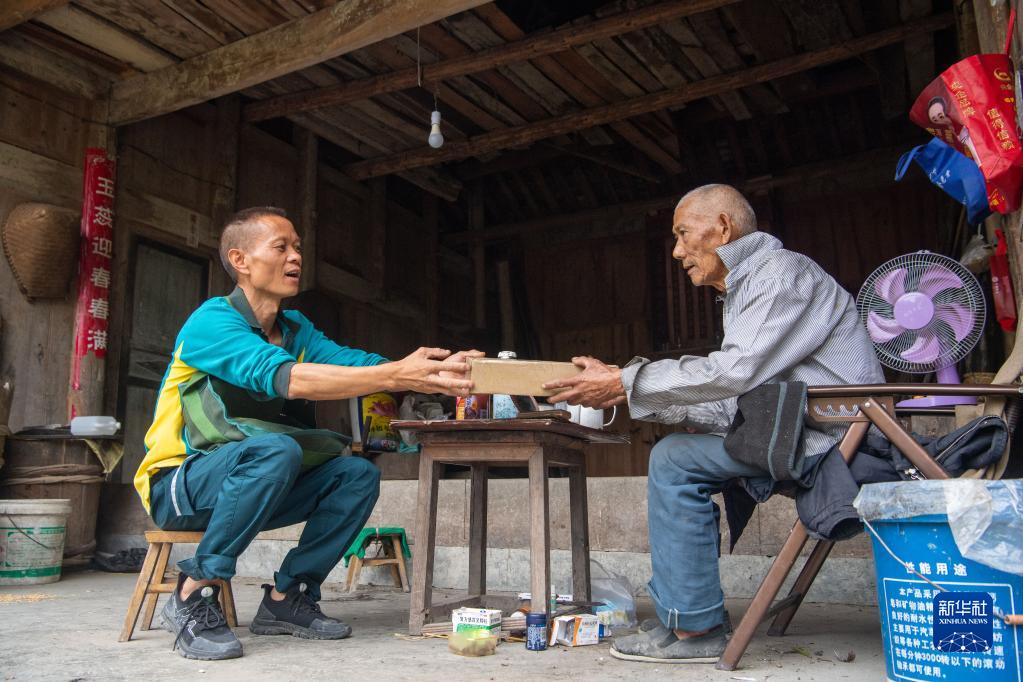 9月15日,投递员张永洪(左)将快递送到行动不便的老人手中。