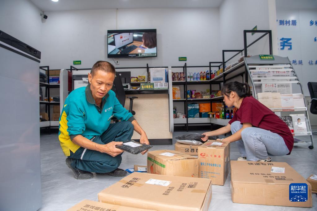 9月15日,在何家岩村村邮站,投递员张永洪(左)整理从大山外运来的快递物品。
