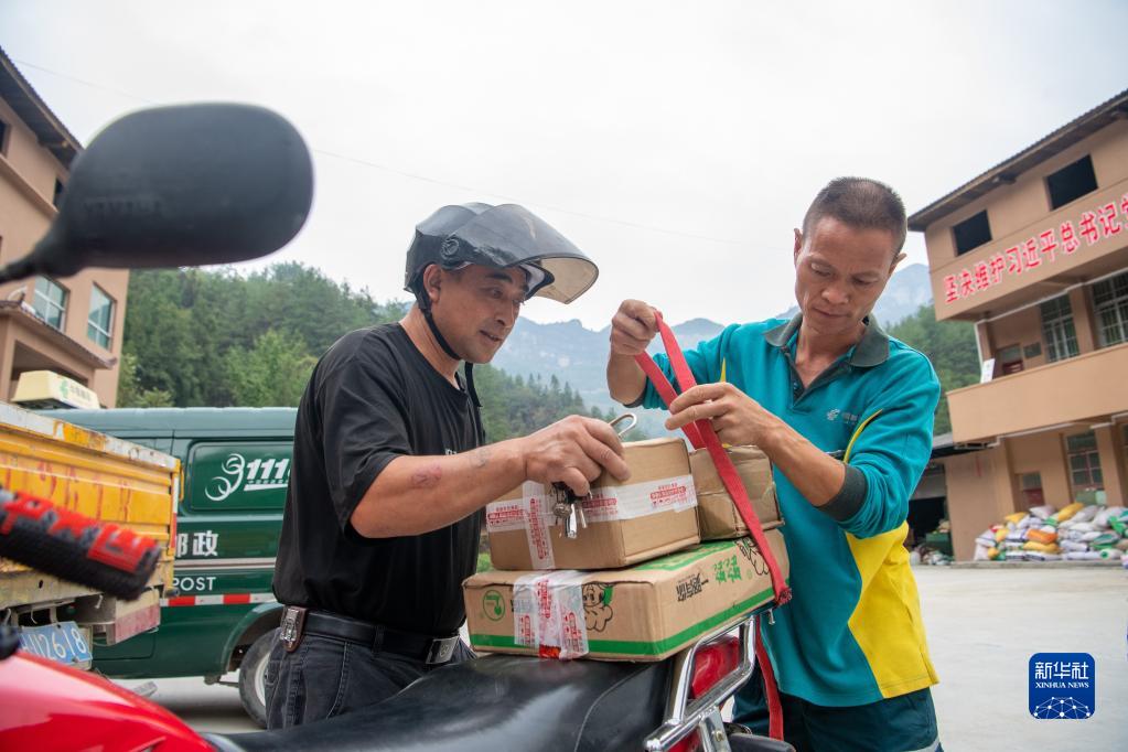 9月15日,在何家岩村村邮站,投递员张永洪(右)帮助村民将收到的快递物品绑上摩托车。