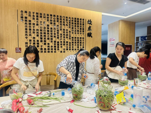 在动手实践环节,居民们纷纷化身“美食工匠”,围坐在操作台前,按照指导专注地处理手中的食材。大家手法从生疏到熟练,仔细地为每一片蔬菜涂抹上精心调配的酱料,空气中交织着蔬菜被挤压的清脆声响与居民们互相交流的轻语。整个教室沉浸于一片繁忙而有序的劳动氛围中,专注的神情与协作的身影构成了生动的社区劳动教育画卷。随着一份份红白相间、色泽鲜亮的泡菜半成品被小心翼翼地装入一个个洁净的玻璃罐中,密封好的不仅是一罐罐等待时间发酵的美味,更是大家亲手创造的劳动成果与对美好生活的殷切期待。活动间隙,大家还就不同地域的泡菜风味、发酵过程中的注意事项以及如何将泡菜融入日常菜肴等话题展开了热烈讨论,分享各自的家常经验与美食记忆。